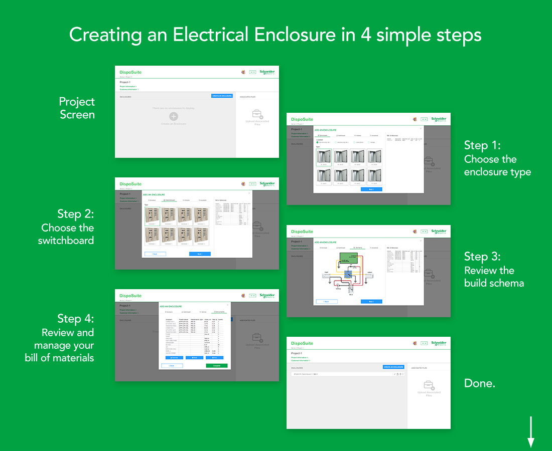 DispoSuite is the web application owned by Schneider Electric. It aims to help electrical technicians plan electrical enclosures, as well as manage cost and material needs.